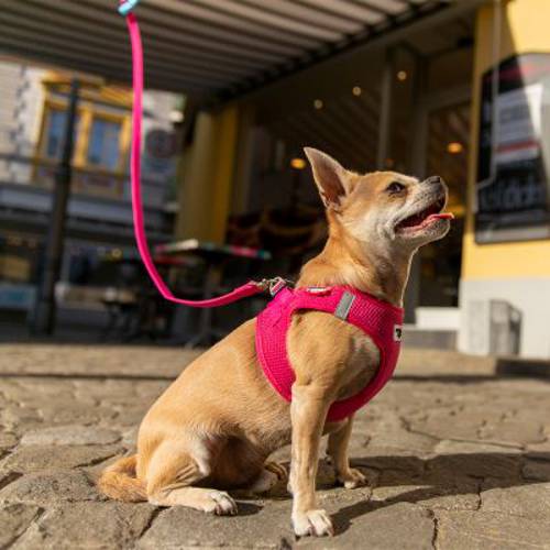 Szelki na klatkę piersiową w kolorze fuksji, idealne dla szczeniąt i małych psów, oddychający materiał, lekkie, rozciągliwe, regulowany rozmiar, optymalny rozkład napięcia, bardzo wygodne, z poliestru Dzięki jasnej kolorystyce w pięknym odcieniu fuksji, Twój czworonóg z pewnością przyciągnie uwag…