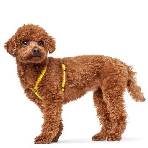 Małe szelki dla psa, wesoły żółty kolor, idealne dla szczeniąt i psów małych ras, z odblaskowymi paskami, miękki materiał, wielostopniowa regulacja, zapięcie i szlufki z tworzywa sztucznego, z nylonu