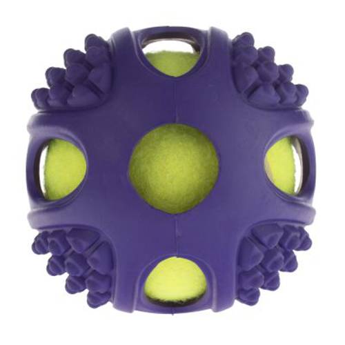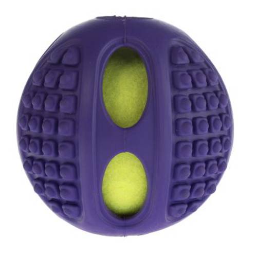Dwie piłki dla podwójnej radości z zabawy! Wewnątrz piłki z solidnego gumowego tworzywa znajduje się piłeczka tenisowa, której intensywny żółty kolor przedziera się przez dziury w gumowej powierzchni. Wystarczy nacisnąć bądź ugryźć piłkę, a umieszczona wewnątrz piszczałka wyda z siebie głośny dźwięk, który dodatkowo wzbudzi zainteresowanie psa i sprowokuje go do zabawy. Elastyczny materiał sprawia, że piłka po rzuceniu odbija się wysoko od podłoża.Tenisowa piłka dla psa 2 w 1 służy do rzucania, aportowania, podskakuje i wydaje piskliwe odgłosy. Jej powierzchnia ma wypustki, które zachęcają psa do żucia i gryzienia zabawki, przy czym stymulowane są dziąsła jego zębów. Zabawka dostępna jest w dwóch rozmiarach, w zależności od temperamentu i wielkości psa. Ta wyjątkowa piłka o wielu zastosowaniach zapewni Twojemu psu wielu godzin swawolnych zabaw i mnóstwo radości.