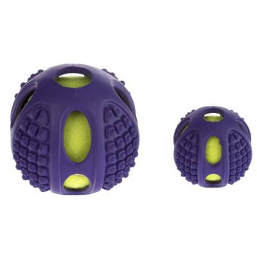 Dwie piłki dla podwójnej radości z zabawy! Wewnątrz piłki z solidnego gumowego tworzywa znajduje się piłeczka tenisowa, której intensywny żółty kolor przedziera się przez dziury w gumowej powierzchni. Wystarczy nacisnąć bądź ugryźć piłkę, a umieszczona wewnątrz piszczałka wyda z siebie głośny dźwięk, który dodatkowo wzbudzi zainteresowanie psa i sprowokuje go do zabawy. Elastyczny materiał sprawia, że piłka po rzuceniu odbija się wysoko od podłoża.Tenisowa piłka dla psa 2 w 1 służy do rzucania, aportowania, podskakuje i wydaje piskliwe odgłosy. Jej powierzchnia ma wypustki, które zachęcają psa do żucia i gryzienia zabawki, przy czym stymulowane są dziąsła jego zębów. Zabawka dostępna jest w dwóch rozmiarach, w zależności od temperamentu i wielkości psa. Ta wyjątkowa piłka o wielu zastosowaniach zapewni Twojemu psu wielu godzin swawolnych zabaw i mnóstwo radości.