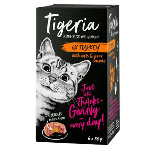 Soczysta rozkosz dla podniebienia z zaskakującym nadzieniem z warzyw, owoców lub wykwintnego łososia, bez zbóż, konserwantów i barwników, bardzo wysoka akceptacjaTigeria to bezzbożowa karma premium dla kotów, która przekonuje niepowtarzalną kompozycją soczyście mięsnego rarytasu z delikatnym nadzie…