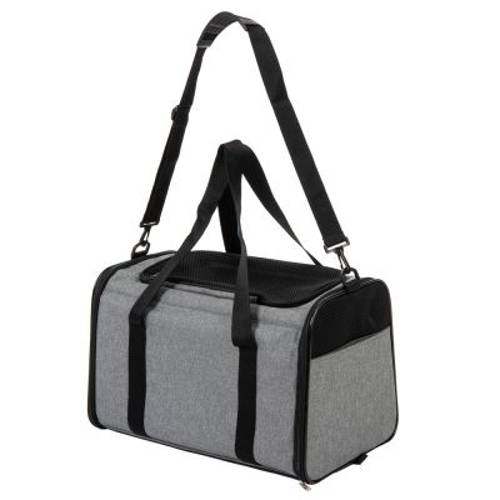 Lekka, szara torba transportowa dla kotów i małych psów do 12 kg, regulowane ramiączka, rozkładany wybieg z siatki, dobra cyrkulacja powietrza, z wkładaną poduszką, duży otwór górny. 45 x 26 x 28,5 cm