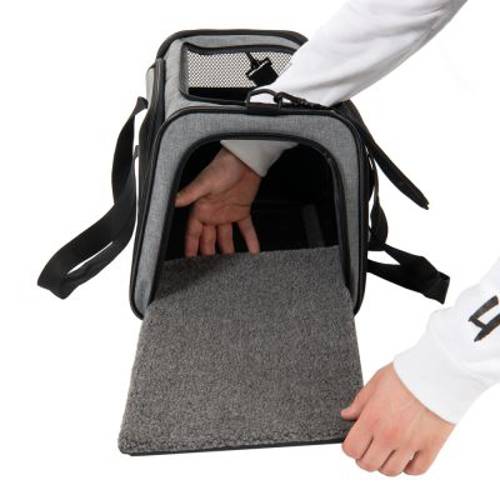 Lekka, szara torba transportowa dla kotów i małych psów do 12 kg, regulowane ramiączka, rozkładany wybieg z siatki, dobra cyrkulacja powietrza, z wkładaną poduszką, duży otwór górny. 45 x 26 x 28,5 cm