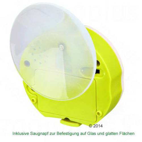 - Wiele możliwości przymocowania przycisku: dołączony do produktu śledzik umożliwia przymocowanie przycisku na trawniku, a przyssawka doskonale sprawdza się na szkle lub gładkich powierzchniach. Do zestawu jest również dołączony gumowy uchwyt, który zapewnia stabilność pojemnika.