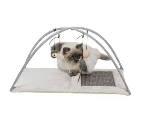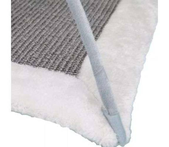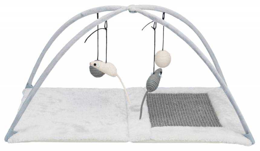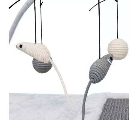 Mata jest niezwykle solidnie i estetycznie wykonana, całość obita jest mięciutkim pluszem. Na jednej połowie usztywnionej podstawy, znajduje się drapak w postaci sizalowej plecionki. Nad podstawą zamocowane są dwa pałąki, na których zawieszone są cztery grzechoczące zabawki w postaci dwóch myszek i…