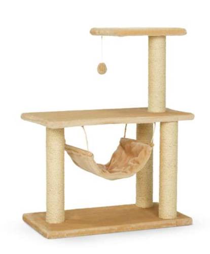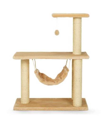 Dwupoziomowy drapak dla kota z hamakiem i piłeczką. Wykończony miłym pluszem w kolorze beżowym