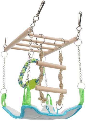Konstrukcja pozwoli zwierzątku na ćwiczenie zwinności i uwolnienie nadmiaru energii. Całość posiada cztery karabińczyki do zawieszenia na klatce.