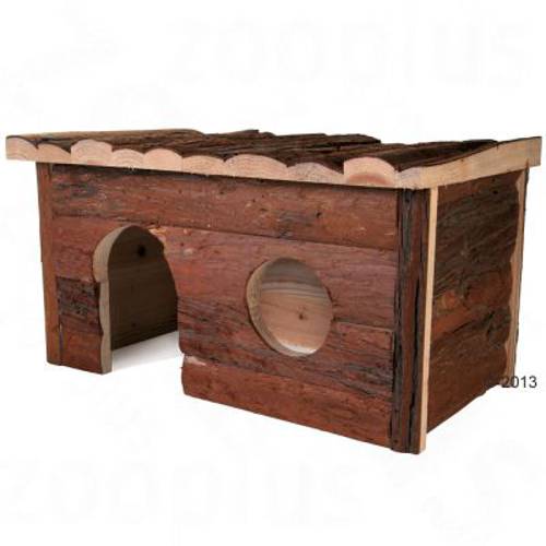 Domek dla małych zwierząt wykonany z naturalnego drewna z płaskim dachemDuzy domek z naturalnego drewna znajdzie swoje miejsce w każdej klatce. Płaski dach może stać się wspaniałym miejscem gier i zabaw lub platformą widokową. Domek Jerrik ma wygodne duże wejście oraz okienko Domek może być podgry…