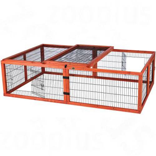 Kojec Natura marki Trixie z odpornego na warunki atmosferyczne, barwionego drewna sosnowego, z otwieranym dachem z metalowej siatki. Może być zestawiony z domkiem dla królików Natura