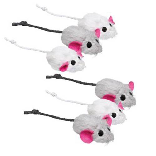 Zabawne myszki pluszowe wypełnione kocimiętką, z włochatego pluszu, ogonkiem ze sznurka, białe i szare, sprzedawane w sześciopaku. Długość ok. 5 cm