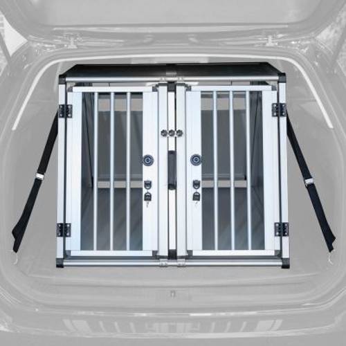 Stabilny i lekki aluminiowy transporter dla psa, ściany i podłoga z drewna ze skosem i szeroko rozstawionymi prętami dla optymalnej wentylacji, z wkładką termiczną, łatwy montażAluminiowy transporter z Trixie to najbezpieczniejszy transport Twojego psa w aucie. Transporter ma w przedniej i tylnej c…