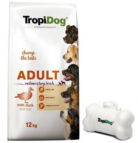 TropiDog Premium Adult M L Duck Rice 12kg + GRATIS