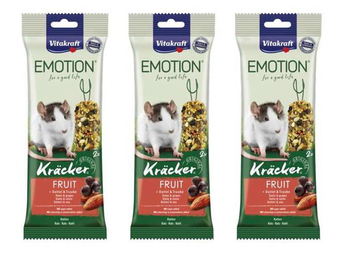 Zestaw zwiera: 3x Vitakraft Emotion Kracker Fruit 2 szt. dla szczura Karma uzupełniająca dla szczura. Pałeczki zbożowe z owocami zawierające TriVita kompleks, który zapewnia właściwe funkcjonowanie serca, mózgu i układu odpornościowego, dbający o trawienie i wspierający zdrowy tryb życia gryzoni…