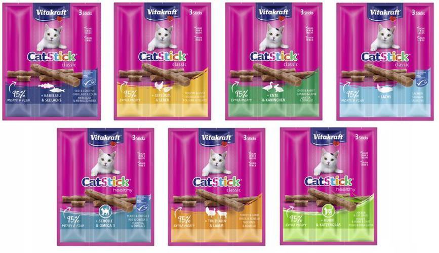 Vitakraft Kabanosy Cat Stick Mini MIX smaków Kultowe już kabanosy dla kota od Vitakraft to idealna przekąska między posiłkami dla Twojego pupila. Każdy kabanos można podzielić na mniejsze kąski dzięki czemu smakołyki starczą na jeszcze dłużej. Vitakraft Cat Stick zawierają aż 95% mięsa, nie zawier…