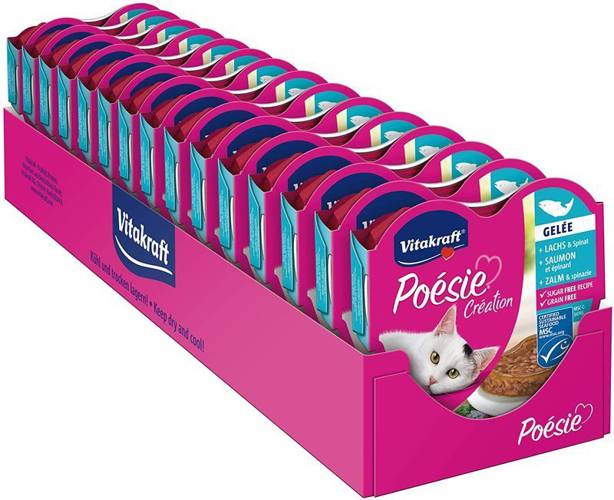Łosoś ze szpinakiem w galaretce. Vitakraft Poesie to kuszące smaki w pięknych tackach w kształcie serca, które pokażą Twojemu kotu jak bardzo go kochasz. Unikalny posiłek w mięsnych kawałkach, zatopionych w smakowitej galaretce to wykwintne danie, które uszczęśliwi nawet najbardziej wybrednego kota…