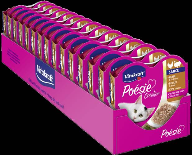 Vitakraft Poésie Kurczak z indykiem w sosie Łatwa rozpoznawalność składników oraz widoczna jakość, Receptura bez cukru, Bez sztucznych barwników, Dostosowane do dziennego zapotrzebowania żywieniowego kotów. Skład: mięso i produkty pochodzenia zwierzęcego (95%, w tym 6% mięso kurczaka, 75% mięsa…