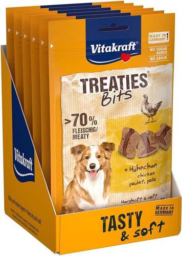 Vitakraft Treaties Bits kurczak 6x120g Mięsny przysmak dla psa wyprodukowany z najlepszych składników i bez dodatku cukru. Każdy pasztecik jest wypełniony nadzieniem i delikatnie przypiekany. To nie tylko wyjątkowa przekąska, ale również zdrowy przysmak między posiłkami. Twój pies pokocha ten mięs…