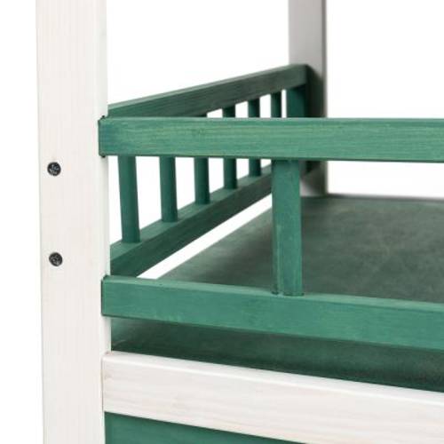 Dwupiętrowy domek z polakierowanego drewna, 2 przestronne kryjówki i 1 weranda z balustradą, do ogrodu, na balkon i do wewnątrz, z odpornym, asfaltowym dachem, zielono-biały