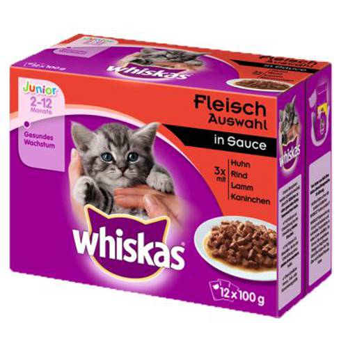 Whiskas Junior to karma w saszetkach - smakołyki dla kociąt, gotowane na parze, z wszystkimi ważnymi składnikami odżywczymi i witaminami dla zdrowego rozwoju. Teraz ulepszona receptura!