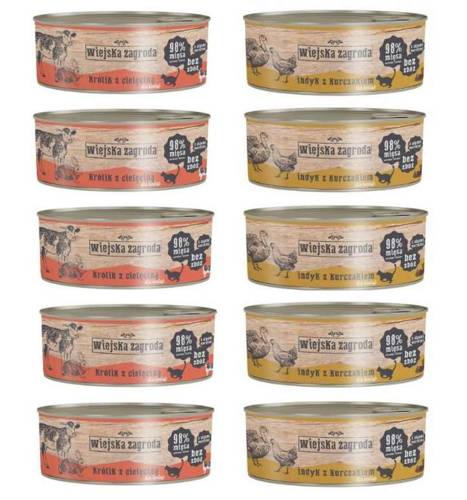 ZESTAW ZAWIERA: - 5 x Wiejska Zagroda Junior królik z cielęciną 85g - 5 x Wiejska Zagroda Junior indyk z kurczakiem 85gWiejska Zagroda to polska marka, która powstała z potrzeby podania naszym kotom tego, czego potrzebują, czyli mięsa! Karma mokra Wiejska Zagroda to pełnowartościowy, zdrowy posiłek…