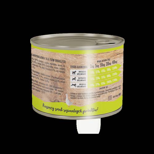 Podstawą posiłku jest zatem duet starannie wybranych mięs w aromatycznym bulionie mięsnym. Polecamy szczególnie psom aktywnym, które potrzebują porządnej dawki odżywczego białka i tłuszczu. Smakowita kaczka w połączeniu z gruszką to kompozycja dla nawet najwybredniejszych smakoszy.
