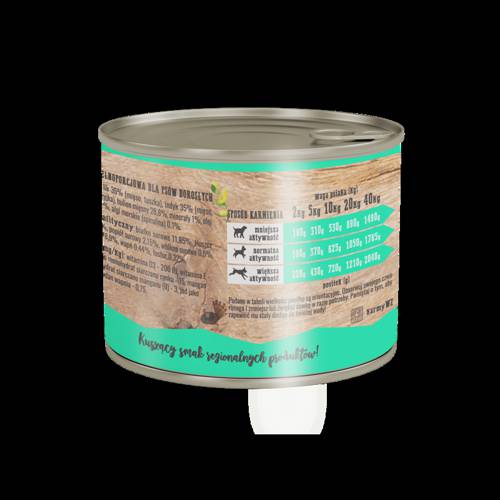 - Świeży olej z łososia - bogactwo kwasów tłuszczowych Omega 3 EPA i DHA, cennych dla sierści i skóry Twojego psa.