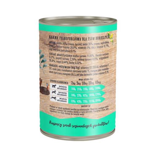 Podstawą posiłku jest zatem duet starannie wybranych mięs w aromatycznym bulionie mięsnym. Połączenie delikatnego i soczystego królika wraz z lekkostrawnym indykiem to świetny wybór dla każdego psa, nawet tego z wrażliwym żołądkiem.
