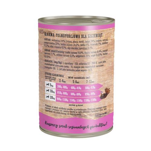 Podstawą posiłku są zatem starannie wybrane mięsa, zatopione w aromatycznym bulionie. Dla naszych szczeniaków proponujemy prawdziwą mięsną ucztę. Połączenie cechującego się dużą przyswajalnością białka oraz dużą zawartością żelaza wołowiny, lekkostrawnego indyka oraz bogatej w cenne witaminy wieprzowiny to zdrowy start dla naszych Czworonogów.