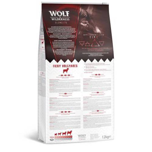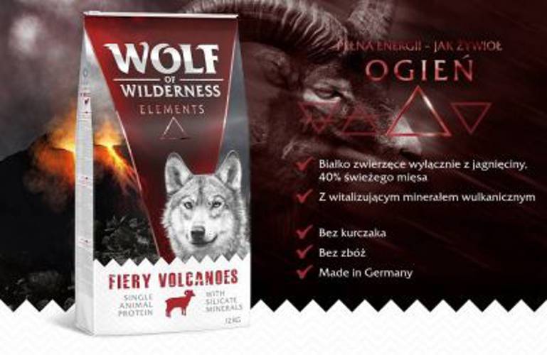 Pierwotną siłę żywiołu ognia można zaobserwować na przykładzie aktywnego wulkanu. Ziemia u jego podnóża jest niezwykle bogata w minerały. Dzięki temu pasące się w pobliżu dzikie owce i jagnięta zachowują siłę i stanowią dla wilka smakowity kąsek.Bezzbożowe karmy dla psów marki Wolf of Wilderness są wzorowane na pierwotnych zachowaniach żywieniowych wolno żyjących wilków, dlatego w „żywiołowej” recepturze FIERY VOLCANOES nie mogło zabraknąć dużej ilości świeżego mięsa i białek pochodzących wyłącznie z jagnięciny – jednej z potencjalnych ofiar wilka. Ponadto karma została wzbogacona zawierającą dużą ilość składników mineralnych ziemią okrzemkową, owocami leśnymi, korzeniami i dzikimi ziołami. Wolf of Wilderness – dziki i pierwotny!