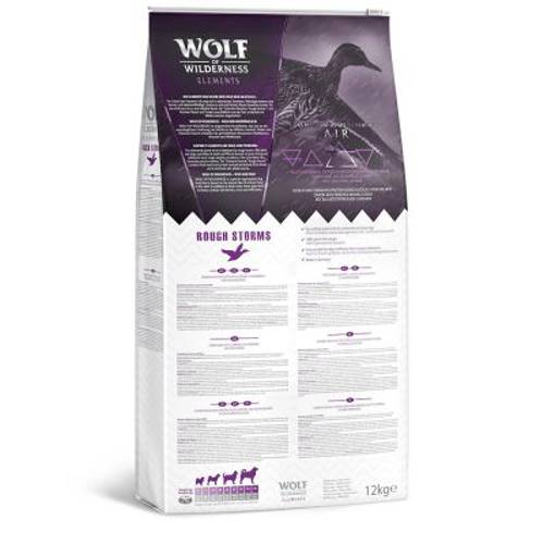Pierwotną siłę żywiołu powietrza można zaobserwować na przykładzie gwałtownych burz. Aby móc sprostać najtrudniejszym wyzwaniom pogodowym, dzikie ptaki spożywają dużo nasion i bogatej w błonnik pokarmowy lucerny. To czyni z nich jedną z ulubionych zdobyczy wilka.Bezzbożowe karmy dla psów marki Wolf of Wilderness są wzorowane na pierwotnych zachowaniach żywieniowych wolno żyjących wilków, dlatego „żywiołowa” receptura ROUGH STORMS zawiera dużą ilość świeżego mięsa i białek wyłącznie z kaczki – jedną z potencjalnych ofiar wilka. Ponadto karma została wzbogacona zawierającą dużą ilość błonnika lucerną, owocami leśnymi, korzeniami i dzikimi ziołami. Wolf of Wilderness – dziki i pierwotny!