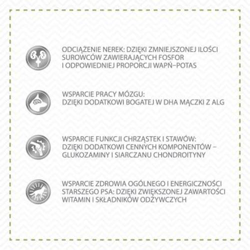 - Odciąża nerki dzięki obniżeniu surowców bogatych w fosfor oraz odpowiednim proporcjom wapnia do fosforu