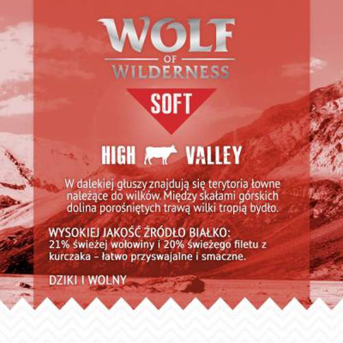 Wolf of Wilderness "Soft - High Valley", wołowina, to karma pełnoporcjowa dla dorosłych psów każdej rasy i wielkości. Dostępna w następujących wariantach: 1 kg, 5 kg (5 x 1kg), 12 kg.