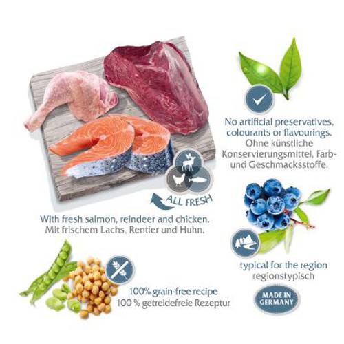 Renifery, dziko żyjące kury i łososie - w tej karmie znajduje się mięso zwierząt żyjących dziko w Skandynawii, nie zawiera zbóż, z dodatkiem borówek, w 100% naturalna