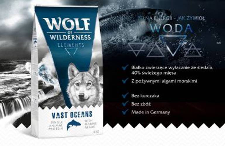 Ryby wprost z szalejących otchłani pełne są bogatych w składniki mineralne alg morskich. Przeniknięte pierwotną siłą żywiołu wody stanowią dla wilków cenną zdobycz.Bezzbożowe karmy dla psów marki Wolf of Wilderness są wzorowane na pierwotnych zachowaniach żywieniowych wolno żyjących wilków, dlatego „żywiołowa” receptur VAST OCEANS zawiera wyłącznie świeżą i suszoną rybę i została wzbogacona morskimi algami. Wolf of Wilderness – dziki i pierwotny!