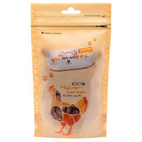 Yummeez pure serca kurze zwabią nawet wybredne psy. Dzięki intensywnemu aromatowi i pysznej konsystencji, przekąski oferują wyjątkowe doznania smakowe pomiędzy posiłkami. Serca kurczaka są liofilizowane (pozbawione wilgoci), ą więc bardzo lekkie i niezwykle aromatyczne. Zachowana jest naturalna struktura mięsa. Yummeez to przysmaki pozbawione jakichkolwiek dodatków, w tym barwników i konserwantów. Smakołyki są bezzbożowe i bezglutenowe, dlatego dobrze nadają się dla zwierząt z odpowiednimi alergiami i nietolerancjami.