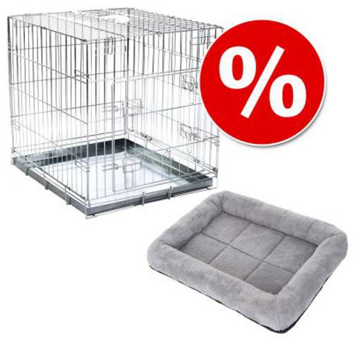 Klatka do pomieszczeń dla psów, z ocynkowanego metalu z wyciąganym dnem, składana, dwoje drzwi, praktyczny uchwyt; z pasującą i wygodną poduszką. W zestawie taniej!
