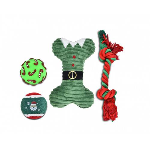Każdy psiak zasługuje na prezent pod choinką! Zestaw zabawek to idealny pomysł na świąteczny upominek. ZESTAW ZAWIERA: - piłka winylowa 6,7cm (średnica) - piłka tenisowa 6,3cm (średnica) - mięciutka kosć pluszowa 21cm - szarpak 32cm Zestaw będzie idealny dla średnich i dużych psów.