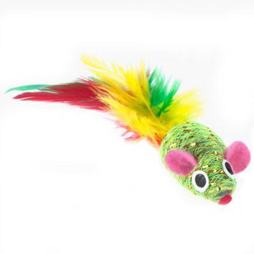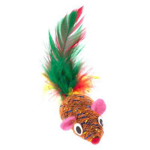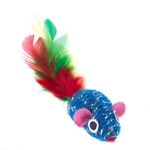 - 3 małe myszki wykonane z kolorowego tworzywa sztucznego z plecionką. Urozmaicone kolorowym piórem w miejscu ogona, które pobudzi kota do zabawy wspólnie z grzechotką.