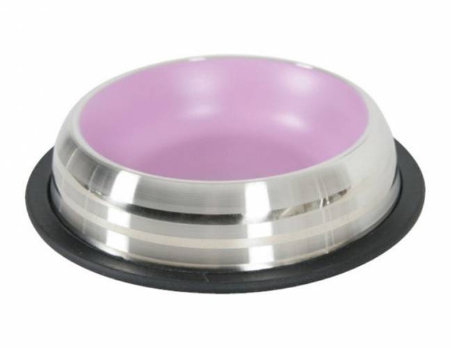 Zolux Merenda miska antypoślizgowa - różowy Metalowa miska wykonana z wysokiej jakości stali nierdzewnej. Na spodzie miski znajduje się zabezpieczenie antypoślizgowe dla lepszej stabilności podczas posiłku. Można zmywać w zmywarce. Pojemność: 500ml