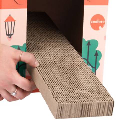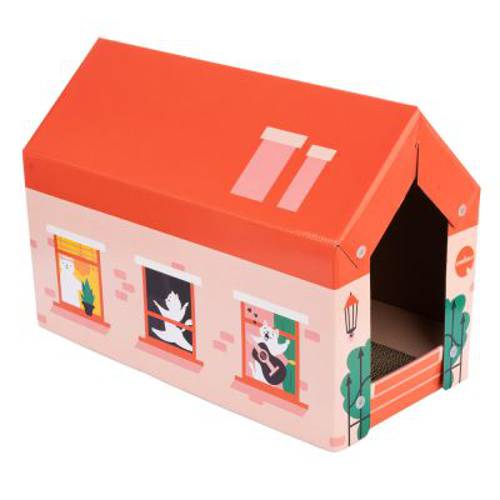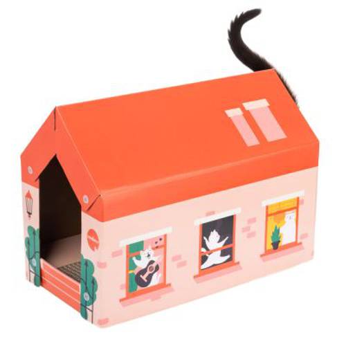 Główną atrakcją wewnątrz domku jest szeroka mata do drapania z tektury falistej. Ten wytrzymały materiał jest szczególnie lubiany przez koty, aby z jego użyciem ostrzyć pazury. Matę można wyjąć i obrócić, co przedłuża jej trwałość.