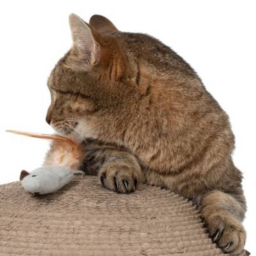 - W komplecie z zabawkową myszką: z ogonem z prawdziwych piór i odrobiną kocimiętki, pobudza do zabawy.