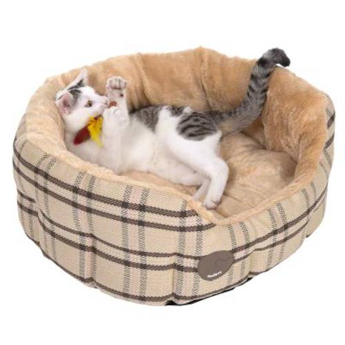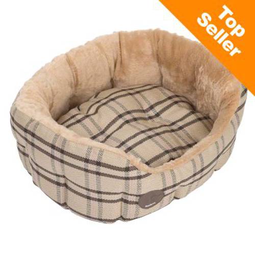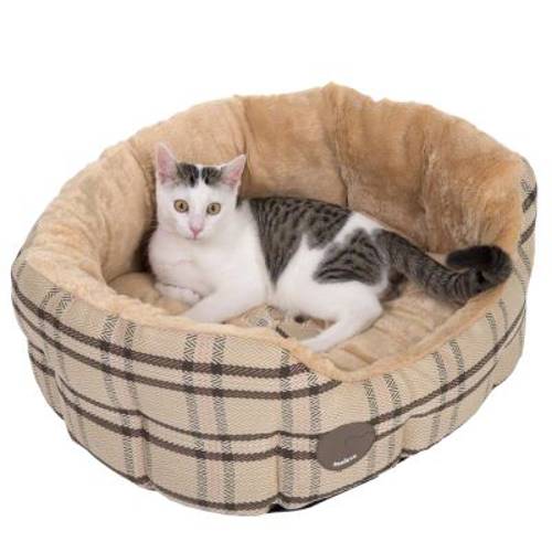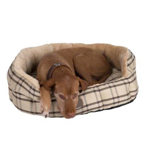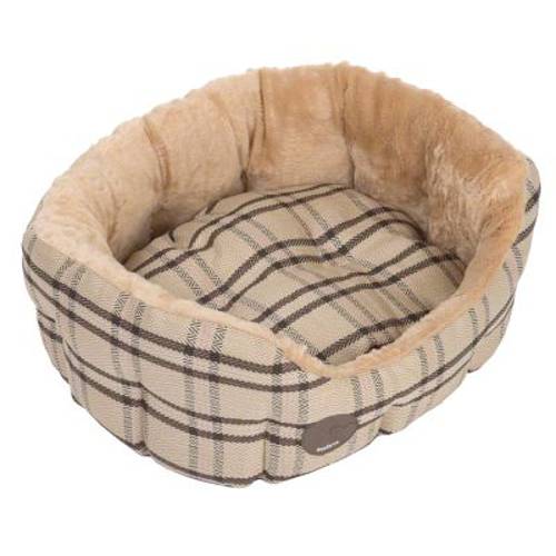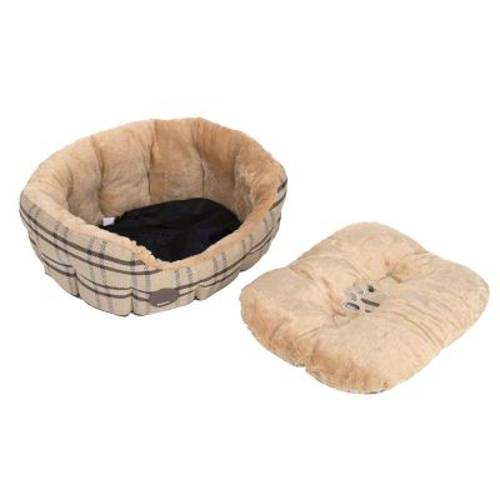 zoolove pomaga! 10% wartości sprzedaży netto przekazywane jest organizacjom działającym na rzecz zwierząt! Owalne legowisko w kratę, z wysokim rantem i dwustronną poduszką; Kolor: beż