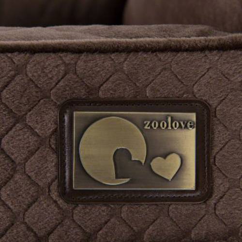 Na przodzie sofy znajduje się naszywka z logo marki zoolove.