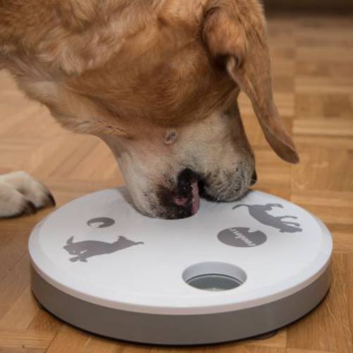 Po pewnym czasie możesz zmotywować psa jeszcze bardziej, umieszczając smakołyki jedynie w niektórych schowkach. Poziom trudności możesz dodatkowo zwiększyć przesuwając przeźroczysty kapelusik na drugi otwór. Twój pies musi teraz przesuwać także kapelusik, aby dostać się do upragnionej nagrody.